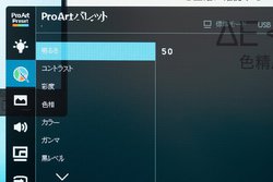 また使用環境に応じて、見やすい画面設定は異なる。例えば筆者は仕事用として輝度を落とす設定にした。本機の「ProArt パレット」機能では、画面メニューから明るさ、コントラスト、彩度、色相、カラー、ガンマ、黒レベル、さらに色設定として6軸色相、6軸彩度を調整可能。ブルーライト調整もレベル0〜レベル4まで設定できるので、目の疲れ対策ならブルーライト軽減をレベル3程度に設定すると丁度いいバランスにできた。
