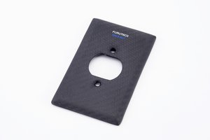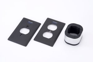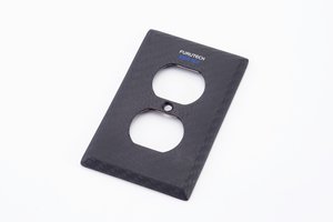 ハイエンドグレード・NCFダンパー・アウトレットカバーの「106-D NCF」(2口タイプ)と「106-S NCF」(1口タイプ)は、ステンレスの母材にNCFを配合したカーボンのシートを貼り込み、硬質の塗装をかけた上で、ソフトな質感のNCFシートで表面を覆ったコンセントカバーである。それも、表裏両方に同様の加工が施されており、たいへんな手間とコストがかかっている。