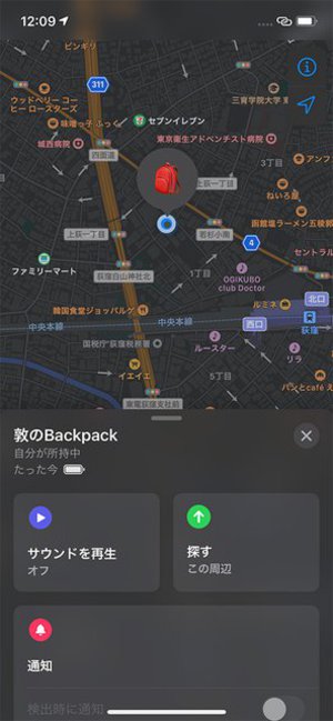 AirTagを装着したアイテムが近くに見当たらない時は、iPhoneなどで「探す」アプリを立ち上げて「持ち物を探す」を開くと、マップ上にAirTagのロケーションが表れる。