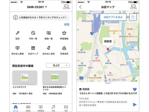ビデオレコーダーのスマートフォン連携は、パナソニックが率先して磨き上げてきた機能だが、5月末にアプリ「どこでもディーガ」をバージョンアップ。録画済番組の屋外への持ち出しや放送中の番組視聴(リアルタイム視聴)、音楽再生や写真の転送/表示といったお馴染みの機能にくわえ、バラエティ番組などで紹介された飲食店の位置を地図で確認・ブックマークに登録できる新機能「お店マップ」が追加された。よく使うボタンをホーム画面の使いやすい位置へ配置できるカスタマイズ機能も用意され、もはやディーガの一部、これなしでは成り立たない水準にまで進化した。