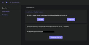 Audirvana Studioはサブスクリプションモデルへの変更に伴い、各種ユーザー設定や使用するPCの管理、ソフトのダウンロード等はウェブ上で行うようになった。他のPCでAudirvana Studioを使う場合は、現在使っているPCを「Disconnect Device」で解除する必要がある。その代わり、Windows/Macをひとつのアカウントでシームレスに利用できる。