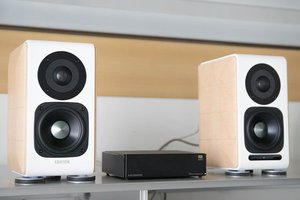まずは、昨今人気上昇中のアクティブスピーカーを使った環境を構築した。今回テストしたのはUSB-DAC内蔵の小型アクティブスピーカーEdifier「S880DB」。市場価格は30,000円と安価だが、95mm径のウーファーとチタン振動板を採用する19mm径トゥイーターによる2ウェイ構成、ハイレゾにも対応、まさに “欲しい機能が全部詰まった” モデルだ。