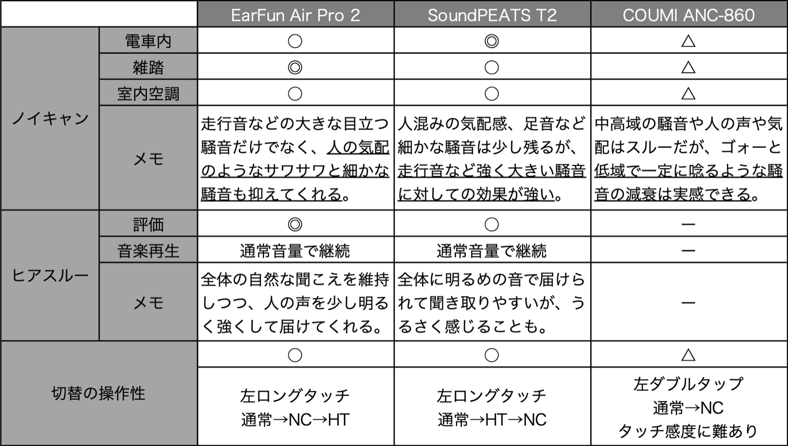 ではいよいよ、一番気になるノイキャン性能をチェック。屋外では電車内の走行中の騒音と、電車を降りて駅ナカの雑踏の騒音。屋内ではエアコンやサーキュレーター、換気扇といった空調周りの騒音に対してのテストを行なった。また同時にヒアスルー周りもチェック。こちらも表にまとめた。