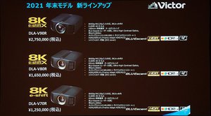 それから3年が経過した2021年冬、遂に登場したのが民生機として世界初の8K入力に対応した新シリーズ、「DLA-V90R」「DLA-V80R」「DLA-V70R」の3モデルである。表示面でも、新開発の「8K/e-shiftX」テクノロジーを投入。ブランドもビクターでの展開に切り替えるなど、同社の意気込みと大きな変化を予感させる。