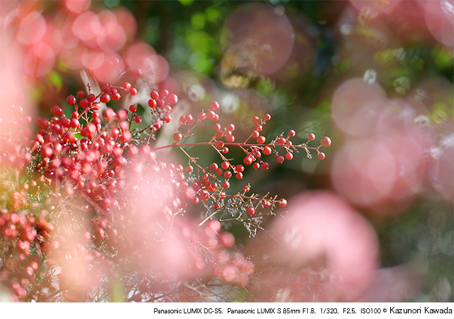 ちょっと絞ってF2.5で撮影したが、絞り羽根は9枚と多く、さらに円形絞りなので光点ボケは円形に保たれる。背景ボケはもちろん、前ボケもクセがなくとてもキレイ。