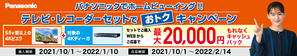 パナソニックでは、55型以上の4Kビエラと対象の4Kディーガをセットで購入してウェブから応募すると、もれなく最大2万円をキャッシュバックするキャンペーンを展開中。