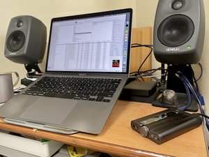 デスクトップでのスピーカーシステムでの利用は、スタジオモニターの定番Genelec社の最小ラインの旧モデルである「6010B」との組み合わせでチェック。最新モデル同士の組み合わせでなくて申し訳ないが、筆者自宅のデスクトップリファレンス機がそれなので……