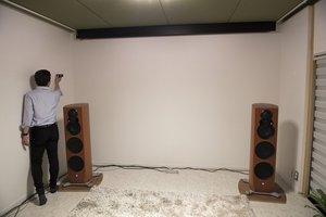 1つ重要な点として、接続完了後には、さらに「スペース・オプティマイゼーション」を適応させる必要がある。パソコンにインストールしたLINNの設定ソフトウェア「Konfig」を立ち上げ、使用している2種類のスピーカーを登録し、部屋のサイズ、スピーカーの位置/リスニングポイントなど合計11箇所の距離を測定。合わせて壁の構造体を設定画面に入力する。入力されたデータは、インターネット経由でLINNのサーバーに送られ、最大ピーク値や周波数の分布を算出する。