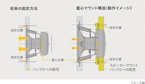 2つ目は、「重心マウント」と呼ばれるテクニクスならではのユニット取り付け技術だ。通常、ほとんどのスピーカーは、スピーカーユニットをエンクロージャー(スピーカー本体)に表面から取り付けることでユニットをマウントするが、この重心マウントは、エンクロージャー内部にスピーカーマウントバッフルを設け、ユニットを重心位置で固定・支持している。