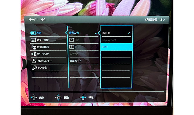 「PD2705U」もAlt Mode対応だから、最近のMacであれば接続はシンプルそのもの。背面のType-CポートにAlt Mode対応のケーブルでつなぐだけ。2018年以降のT2チップを搭載したMacの場合、これで4K HDR対応の外部ディスプレイとして利用できてしまう。背面のType-Cポートは65W給電(20V/3.25A)にも対応しており、13インチ級であればMacBook Proの高速充電も可能だ。
