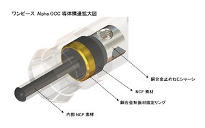 新プラグ「CF-102 NCF(RCA)」は、センターピン内部に特殊素材「NCF」が注入された、αOCCロジウムメッキのワンピース中心導体を採用していることが最大の特徴だ。α銅合金ロジウムメッキボディを基に、ハウジングはステンレス製基材に、NCFと銀メッキカーボンファイバー層、特殊クリア硬質コート塗料仕上げの外装という入念な3層構造となっている。同社のフラグシップ電源プラグとIECコネクター「FI-50M NCF(R)」「FI-50 NCF(R)」と同様に、高級感触れる仕上げとともに、高い制振効果と静電効果を実現し、低ノイズな伝送性能が追求されている。