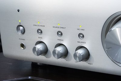 左端の電源スイッチの右に3つ並んでいる小さなスイッチは、左からデジタル回路とインジケーター回路をオフにするための「アナログモードスイッチ」、信号がトーンコントロールとバランス調整回路をパスする「ピュアダイレクトモードスイッチ」、フォノイコライザーの「MM/MC切り替えスイッチ」だ。