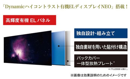 新世代の高輝度有機ELパネルを採用し、さらに独自の高効率な放熱構造を組み合わせて、基礎体力を強化した「Dynamicハイコントラスト有機ELディスプレイNEO」に加えて、表示映像によるパネルの発光状態を時間軸も加えて3次元分析し、独自のアルゴリズムで電流制御する「Bright Booster」機能で、パネルが持つ発光能力を余すところなく引き出す。