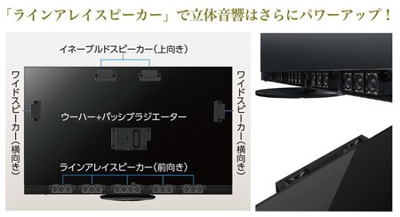 テレビの本分である高画質を極め、さらに本機の評価を決定づけたのが「サウンド」の充実である。そもそもコンテンツは、映像とサウンドの両輪で成り立っているエンターテインメント。テレビが薄型化されて以降、スピーカーボックスの容積を確保するのが難しく、各社が様々な取り組みで改善を試みてきたが、難易度の高いものだった。