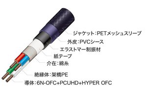 導体は高純度の6N-OFCと最新ハイテク素材のPCUHD、そしてディップ・フォーミングという特殊な製法で作られたHYPER OFCの3種ハイブリッドで、6N-OFCは音の輪郭と高域の伸びを、PCUHDは低域の力感と広大な音場を目指しての採用だが、HYPER OFCはおそらく音の厚みとコクを加える目的であろうと推測する。