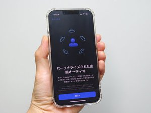 メニューを開くと「パーソナライズされた空間オーディオ」の項目が増えている。「続ける」をタップしたあと、ガイダンスに従ってセットアップを進める。