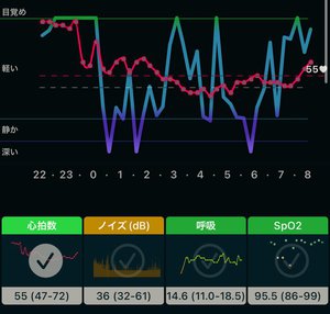 もっともApple Watchのメリットには、アプリで機能を追加できるという点がある。これは安価なスマートバンドには無い特徴だ。たとえば「AutoSleep」という睡眠計測アプリを入れることで、睡眠状態を計測できるようになる。睡眠時の騒音の大きさや血中酸素レベルなど、さらに踏み込んだデータ表示にも対応する。
