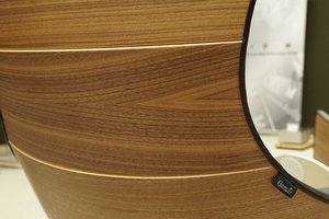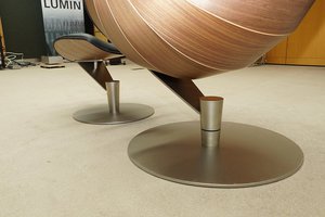 大きくカーブさせ、体を包み込むようなデザインはまるで映画『2001年宇宙の旅』に出てくる近未来的イメージで、木目も美しい。わずかに傾いた形状は、理想的なリスニングポジションを保つよう調整されている。伝統の家具職人のノウハウを活かし、心地よい座り心地や強度など人間工学的にも練られたものだろう。