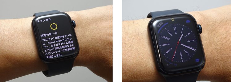 ただし低電力モードをオンにすると、ディスプレイの常時表示や心拍数/血中酸素ウェルネスのバックグラウンド計測はできなくなる。またペアリングしているiPhoneが近くにないと、Wi-Fiやセルラーによるモバイルデータ通信、着信通話と通知も使えなくなる。GPS+Cellularモデルの場合は特に注意したい点だが、バッテリーが残り少なくなった緊急時などに、低電力モードのメリットが存分に発揮される。