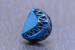 Maven Proの実機をチェックしていこう。実物を手に取ると、その造形の美しさに驚かされる。従来機のMavenがシルバーだったのに対し、Maven ProはPVDナノコーティング技術によってサファイアブルーに輝いている。これが実に深みのある上品な青色だ。浅い三角形の彫りは、伝統工芸品の彫金のように美しい。見る者を魅了し、所有欲を刺激する不思議な魅力を帯びている。