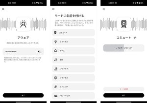 アプリでは、Quiet/Awareモード以外に、ユーザーが任意に2つまでモードを追加することも可能。利用シーンに合わせて、ANCの効き具合を「0」から「10」までの11段階から選んで設定できる。追加したモードには、「ウォーキング」や「音楽」など10種類ある名称から選ぶか、モード名をつけることも可能。切り替えた際にはモード名を読み上げてくれるので、いまどのモードかすぐにわかる。