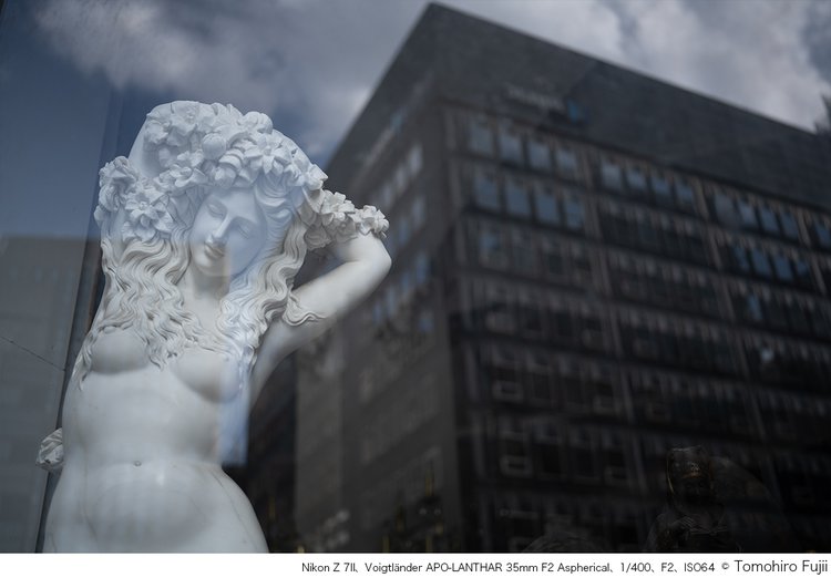 切削加工によるローレットは重厚感があり、コンパクトながら存在感のある仕上がりだ。重量は360gあり、手にすると金属製らしいずっしりした感触が伝わってくる。しかし組み合わせたニコン「Z 7II」とのバランスはよく、軽快に撮り歩くことができた。