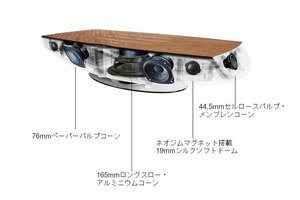 そして何よりもソナス・ファベールの製品として、スピーカーを中心にオーディオの高音質化対策が充実していることがポイント。スピーカー部の構成はなんと4ウェイ・7スピーカーで、合計490WのD級アンプで駆動する。スピーカーユニットこそソナス・ファベールの腕の見せどころだが、本体前面には強力なネオジムマグネットで駆動される2基の19mmシルク・ソフトドームトゥイーターと、2基の76mmペーパーコーン・ミッドレンジユニットを、そして165mm径のアルミニウムコーン採用のウーファーユニットを底向きに搭載する。