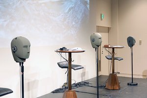 会場では、3名の前にダミーヘッドマイクNeumann「KU100」を1台ずつ設置し、繰り広げられるトークをバイノーラル収音。客席にはヘッドホンアンプが設置されており、観客は、自身が持参したイヤホン/ヘッドホンを通して3人のトークやASMR音声をフルアナログで楽しむスタイルが採用された。