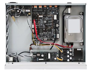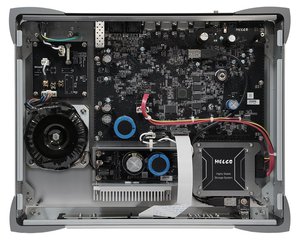 これに加えて本機は、新規に音質重視のカスタム仕様の大容量SSD(3.8TB)も開発し搭載した。電源部には、お家芸とも言えるスイッチング電源+大容量キャパシターバンクではなく、リニア電源を搭載。大型トロイダル・トランスを使用し、フィルターコンデンサーとして6800μF/35Vのニチコンのスーパー・タフを1式、1万μF/40Vのヴィシェ製を2式使用し、高品位で安定した電源部を構成している。また、前述のデジタル処理部にもニチコンのKWやMUSEといった高品位コンデンサーを採用している。