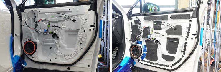 仕上げはインナーパネルを取り囲むようにサウンドプルーフィングウェーブとサウンドプルーフィングテープを装着して、最初に取り外したドアトリムを取り付ければ作業完了だ。