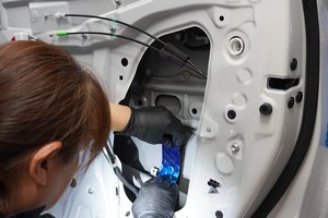 さて、施工前の状態を確認したあとは、千葉県のカーオーディオ・カーセキュリティ専門店「サウンドエボリューション ログオン」に車両を持ち込み、いよいよAT-AQ409の施工をしてもらう。パッケージに同梱される制振材などの貼付け作業を担当したのは、同店の紅一点、デッドニングマイスターの小溝梨奈さんだ。