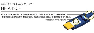 そのフルテックから、光ファイバーとα-導体のハイブリッドで構成されたHDMIケーブル「HF-A-NCF」シリーズが登場した。「HF-A-NCF」は、8K信号(8K/60p/48Gbps)の安定伝送が可能なHDMI 8K V2.1 AOCケーブルだ。ウルトラハイスピードの認証を取得しており、このカテゴリーでNCFを採用したのはフルテックとして初だという。
