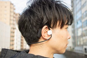 装着感についてはどうだろうか。一見すると一般的な「ネックバンドタイプ」の骨伝導イヤホンと違いがないように見えるが、まずはワイヤー部分の処理の仕方に注目したい。通常は耳へ引っ掛けるフックの部分から後頭部にワイヤーを回すことになるが、このワイヤーが耳の上ではなく耳の下を通すスタイルになっている。