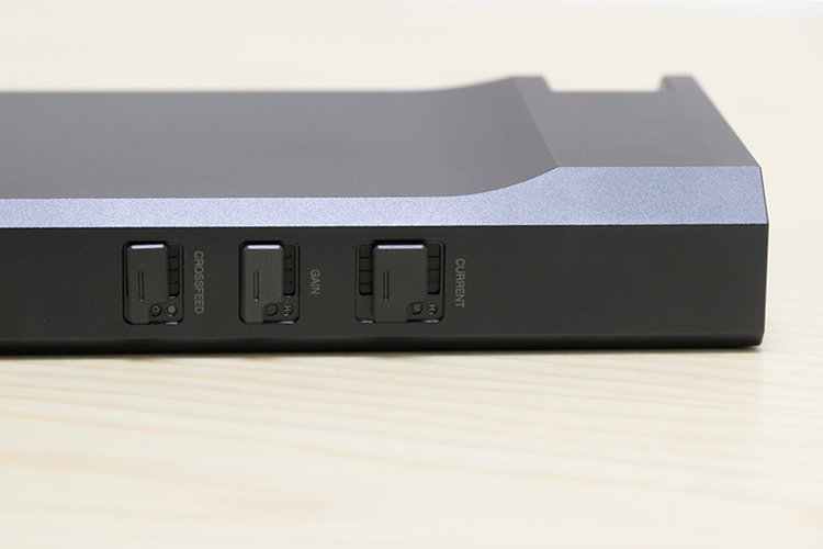 ボディ側面には3つのモード切り替えスイッチを用意。それぞれカレントコントロール、ゲインコントロール、ハードウェア・クロスフィードのモードを切り替えられる。