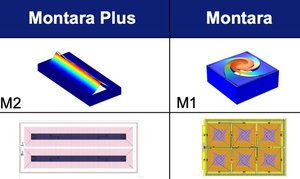 具体的には下図を見てほしい。これは「Montara」と「Montara Plus」のCGによる解説図だ。例えば「Montara」では図の正方形の青い部分は筐体であり、赤く着色された部分が電圧により稼働する。「Montara」ではこの正方形が6つで1ユニットになっている。「Montara Plus」ではやはり長方形のユニットの中央部分の赤いところが稼働する。これが2つで1ユニットとなる。つまり乱暴に言えばICの一部が電圧で動いて空気を振動させるわけだ。