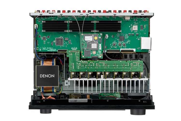 パワーアンプ部はさらに贅沢な構成になっており、前モデルのAVC-X4700Hは5ch分と4ch分の2枚の基板でパワーアンプが構成されていたのに対し、AVR-X4800Hではパワーアンプの基板をなんと1chごとに分離させ、それを9個組み込む「モノリス・コンストラクション・パワーアンプ・レイアウト」を採用した。ひらたくいえば、ハイエンド機と同等のパワーアンプ構成となっているのだ。