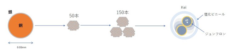 「KEI」の構造。0.08mmの銀コート銅線を50本撚って、さらに3本を撚って(150本)ジュンフロンでタイトに包む。それを2本捻った状態で透明な柔らかい塩化ビニールで包んでいる
