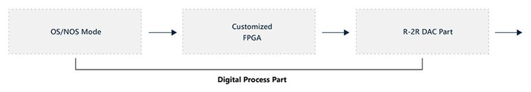 そして、2つ目のポイントは、独自FPGAを用いたOSモード/NOSモード切り替えについてである。このFPGAはR-2R方式DACの前段に配置されており、再生される音源のデジタル信号(SE300では最大PCM 384kHz/32bit、DSD 11.2MHzに対応)をR-2R方式で処理しやすいよう、24bit化する行程も担っているようだ。