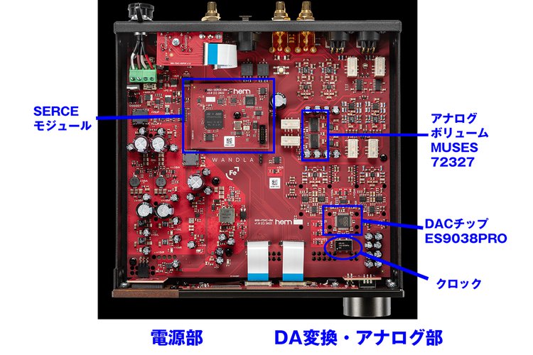 まず、デジタル入力信号の流れとして、注目したことは、中央付近にある四角い基板です。これは独自開発の「SERCE(セルチェ)」というデジタル処理部モジュールです。アナログ信号以外のUSB、AES/EBU、S/PDIF、HDMIなどのデジタル信号は、すべてこのモジュールで処理されます。そのコアとなるのが、ARMプロセッサーです。USBレシーバーや前述の独自フィルター、MQAデコーダー処理を行うほか、バーブラウンのデジタルトランシーバー「DIX4192」を使用したAES/EBU、S/PDIF入力の伝送処理も行なっています。