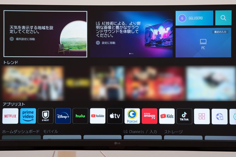 本モデルの最大の特徴は、やはり独自の「webOS 22」を投入した点であり、スマートテレビと同様にVODサービスを手軽に楽しめる。YouTubeをはじめ、Amazon Prime Video、Apple TV、Disney+、Netflix、Hulu、U-NEXTなど、幅広いVODサービスをプリインストールしている。