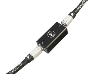 LANケーブルでのノイズを低減するアクセサリーは、すでに各社からいくつも発売されている。それだけ需要が多いということだが、コード・カンパニーによるとネットワークではとりわけモデムやルーター経由でのノイズが目に見えて大きいという。それ以外の外来ノイズも含めて、ネットワーク経由で流入するノイズを低減するのが本機である。