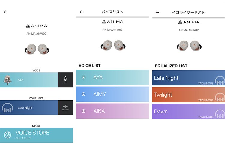 また、ANW02の体験に外せないのが、専用アプリ「ANIMA Studio」だ。独自機能のひとつに、「Advent Voice」という音声きせかえ機能を搭載する。日本語のボイスガンダンスを好みに変更できるもので、デフォルトでもAYA /AMIY/ AIKAの3パターンから選択可能となる。さらにボイスストアから、他の音声の購入も可能だ。