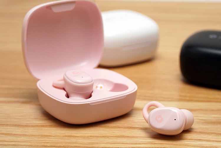 イヤホン本体の筐体も耳に収まりの良い小型筐体に作り替えられ、完全ワイヤレス初心者にも優しい装着をサポートするスタビライザーは引き続き搭載している。本体はホワイト、ブラック、ピンクのカラバリ3色も展開する。