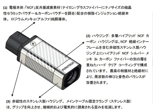 【Powerflux-C15 NCF-18】●接続部端子部:プラグ(カーボンファイバーNCF仕様)→FI-50M NCF(R)、IECコネクター(スリムタイプのカーボンファイバーNCF仕様)→CF-C15 NCF(R) ※単独販売未定●特殊素材「NCF」をプラグボディ部に調合。ナノ単位のセラミックパウダー、カーボンパウダーによるこれまでの強力な制振効果に加え、静電効果を向上●端子接点:非磁性ロジウムメッキ●ケーブル素材:α-導体(OCC素材)の高密度導体●絶縁材:カーボンパウダー調合の高機能PVCを用いた2重シース構造(振動と外部からのノイズを遮断するとともに柔軟性を合わせ持つ)●ケーブル直径:約 17.5mm●定格:15A 125V〜(日本/米国/カナダ等)、10A 250V〜(欧州連合地区)