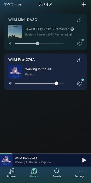 このようにしてグループとして音楽を再生すると、二台のスピーカーからステレオで音楽再生ができる。今回は左右別機材を用いた変則的な組み合わせなので音質的にはコメントはしないが、左右同じ機器を使用すれば、同じ部屋の離れた場所のスピーカーの設置をケーブルの取り回しに苦労せずに行うことができるだろう。スマートスピーカーのステレオペアにも似ているが、WiiMデバイスを使えば自分で好みのスピーカーを選ぶことができる。