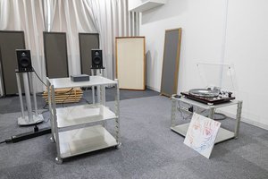 次に同じくグループ化機能を用いてマルチルームシステムを組んでみた。(実際には同じ部屋だが)マルチルームを想定して、書斎にあるアナログプレーヤーの音(下記の写真右)を、リビングルームにあるスピーカーから再生する(写真左)というシステムを想定した。アナログプレーヤーにはWiiM Mini、スピーカーにはWiiM Proを組み合わせる。