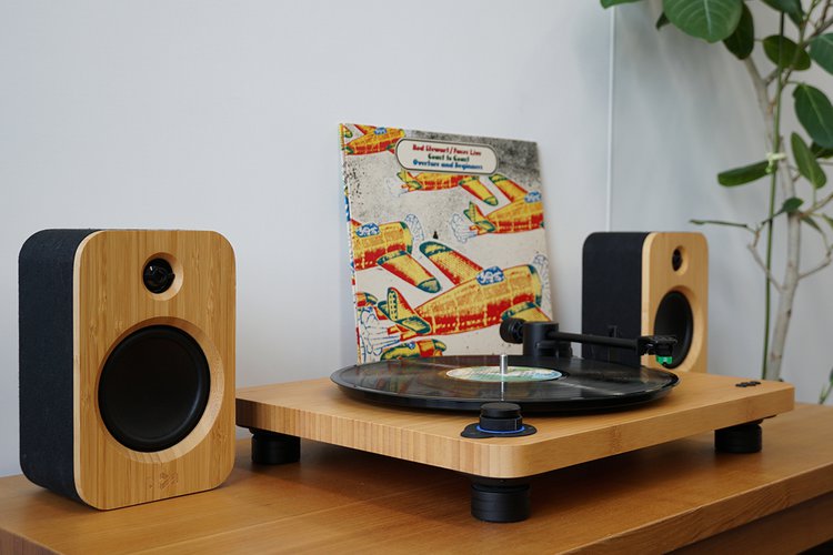 サウンドのテストは、まずはじめにBluetoothスピーカー「GET TOGETHER DUO」を接続して実施した。本機はHouse of Marleyの人気ブックシェルフ型スピーカーで、プレーヤーと同じくボディ前面には竹が使用されている。