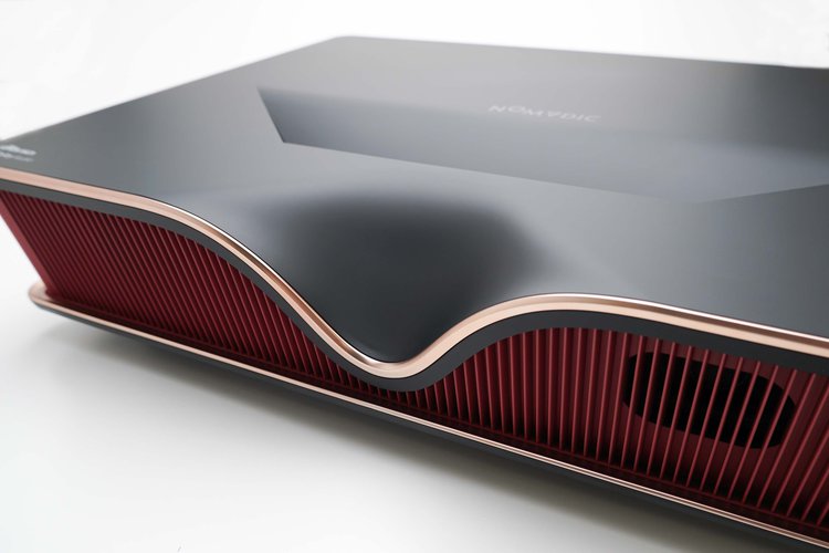 P2000UST-RGBは本体デザインにも特徴がある。超短焦点プロジェクターということもあり本体は映像を投写するスクリーンのすぐ下に配置することになるが、映画館の幕が上がる前の赤色の幕をモチーフにしたような優美なデザイン。よくみるとスリットが設けられ排熱も考えられた構造になっている。