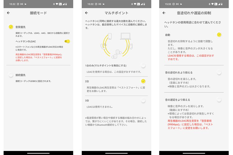 いよいよEAH-AZ40M2の音質をチェックしていこう。再生環境はスマートフォン「Xperia 1 W」を使って、LDACによる96kHz/24bit再生を試す。アプリから接続モードの設定を開き、「音質優先」かつ「ヘッドホンのLDAC」にチェックしてテストした。