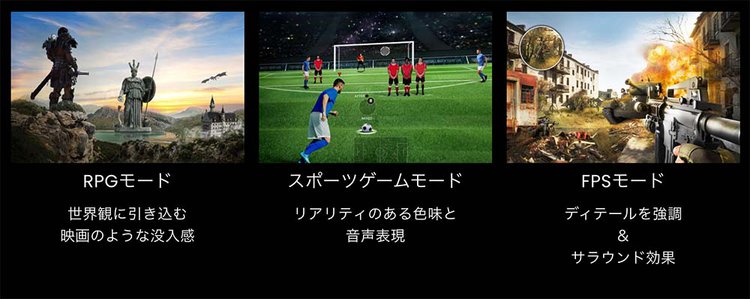 FPSの『エーペックスレジェンズ』では、やはり超大画面の見通しの良さと色バランスの良さが冴える。プレイにおいても映像の遅延を感じることなく快適に楽しめることを確認できた。FPSプレイ用のセッティングとしては特にサウンドをFPSに切り替えることが重要で(PS5ではHDR-FPSの設定を利用可能)、これにより低音をカットして足音の位置と、音の定位をはっきりと認識しやすくする。本格的なゲームプレイ向けに活用して欲しい機能だ。